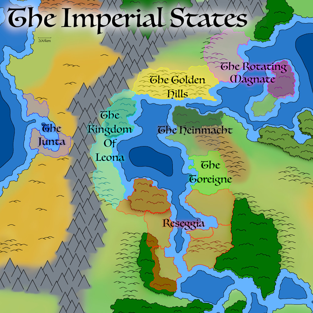 The people of the Toreigne have since lived in a form of lawlessness and anarchy. The area is still ravaged by plague, and worse; is roamed by strange monsters set free in the wake of the collapse, yet nobles and bandit lords alike still strive for power amongst the wreckage. Allegio Tora was one of these opportunists. He sought to have a claim over the ruins, but held little power. However, he was chummy enough with the rulers of the other Imperial States to be able to secure a claim in the Treaty of Leona. Now, he is the king of the Toreigne, but he is king in name alone.